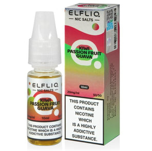 Kiwi Passion Fruit Guava nic salt e-liquid by Elf Bar Elfliq is a complex medley of fruity flavours. The passion fruit and guava deliver an overall sweet note, sharpened by tangy kiwi.